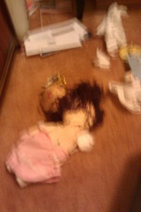 I was pretty calm at first. After all, I knew Grandma Bear was no more and had already searched the internet trying to find a replacement. When I saw the dining room I began to get more upset, realizing the damage and the cleaning I would have to do after the long ride home. At the top of the stairs my heart started to pound when I saw that the entrance to each room paved with trash from the small trash baskets. But when I walked into the Grandkids Room, I couldn’t help it – I let out a small cry and began to weep. The other stuff was just that – stuff. But the sight of that special doll mangled, with her pantaloons halfway off and face down on the floor as if she had been violated, was the last straw. She’s so old and unique I don’t know if I can find a replacement, but even if I can it won’t be the same as receiving from a special friend who had owned it for years and out of love gave it to me. Not the same at all.